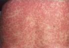 3.猩红热 前驱期发热咽痛明显。1~2天后全身出现针头大小红疹,疹间皮肤充血,呈现一片猩红,压之退色。疹退后可发生大片脱皮,血液白细胞总数及中性粒细胞增高显着。